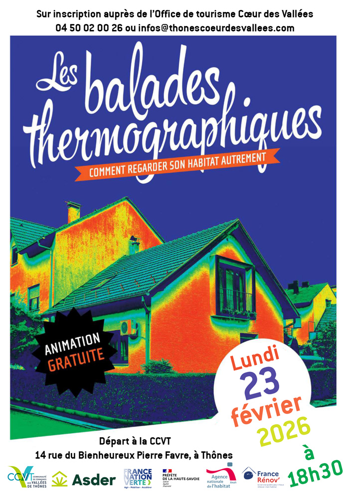 La soirée débutera en salle, pour échanger sur les enjeux de l’isolation de votre logement et comprendre le fonctionnement d’une caméra thermique. Puis, munis de caméras et guidés par un conseiller France Rénov’ 74 de notre partenaire Asder, vous analyserez les maisons et immeubles croisés pendant la balade.